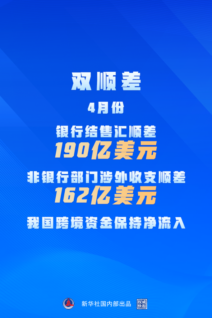国家外汇管理局17日发布的数据显示,4月份银行结售汇顺差190亿美元,与一季度月均水平相当;非银行部门涉外收支顺差162亿美元,环比增长57%。