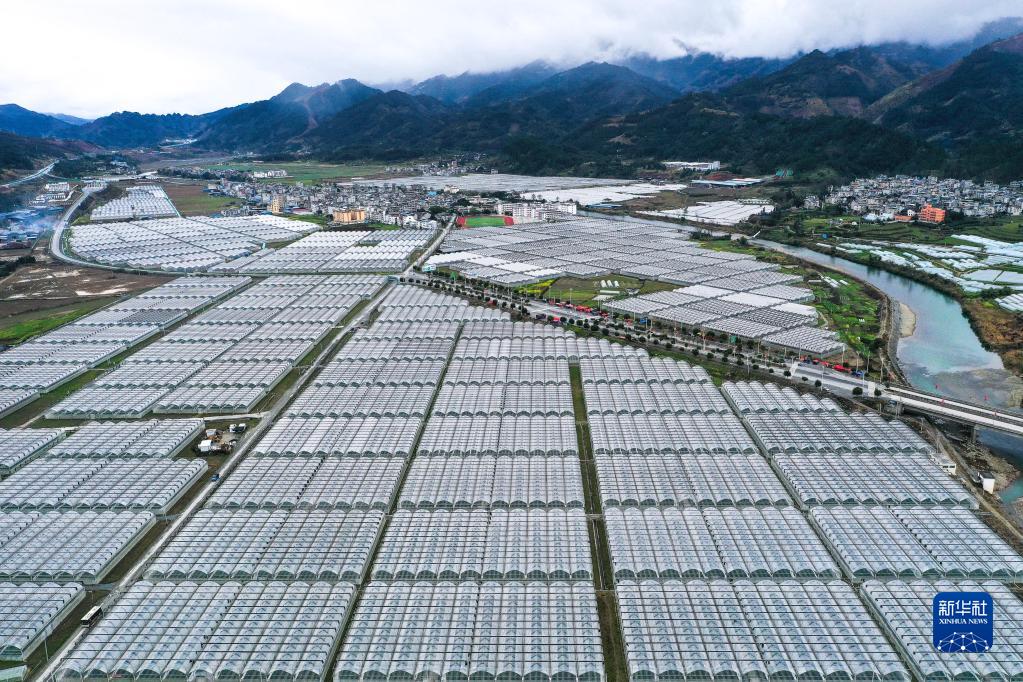 贵州省榕江县车江坝区的人工智能调控大棚蔬菜种植区(2月18日摄,无人机照片)。新华社记者 杨文斌 摄