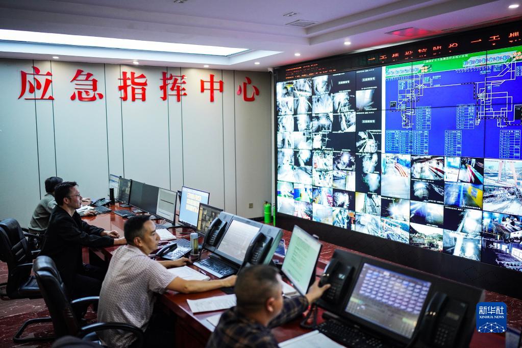 贵州盘江精煤股份有限公司山脚树矿矿长王海涛(左二)与管理人员在应急指挥中心进行综合调度(5月18日摄)。新华社记者 陶亮 摄