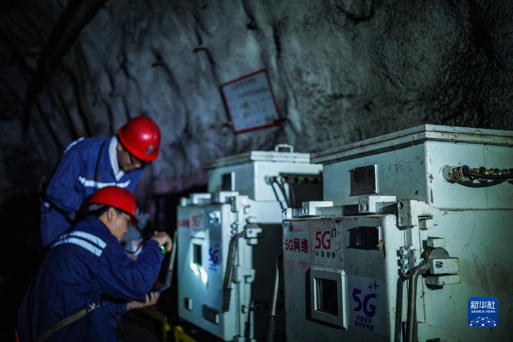 贵州盘江精煤股份有限公司山脚树矿工作人员在井下检查5G基站控制器运行情况(5月18日摄)。新华社记者 陶亮 摄