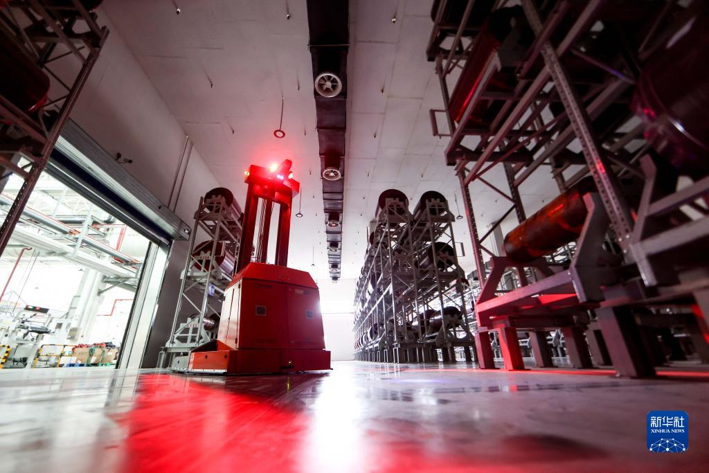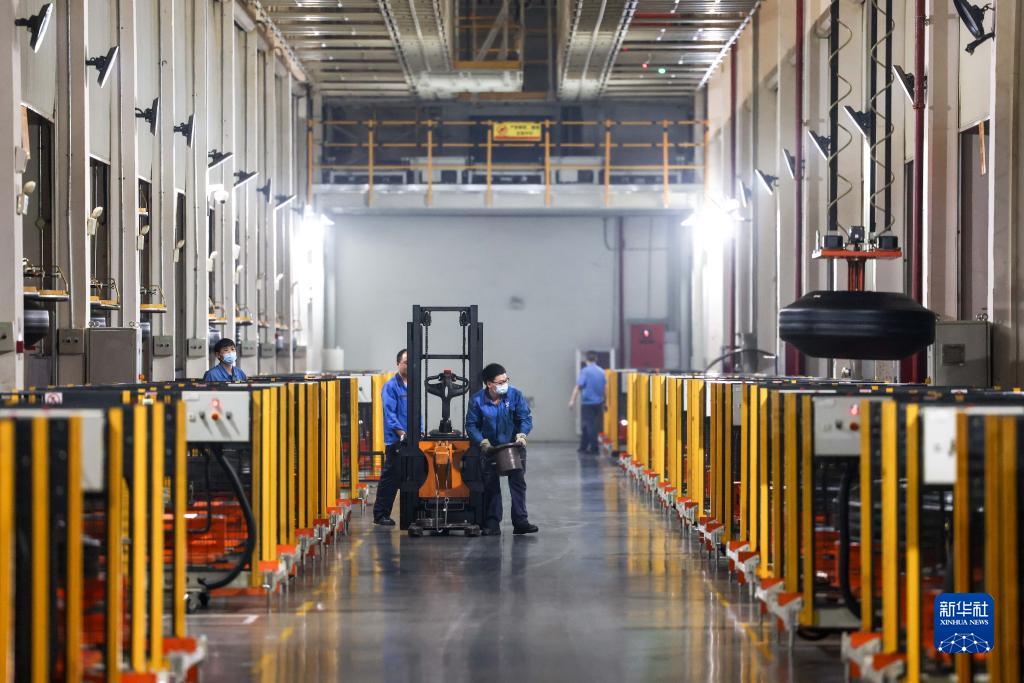 AGV无人搬运小车在贵州轮胎股份有限公司“5G全连接工厂”的部件生产区内工作 (5月17日摄)。新华社记者 欧东衢 摄