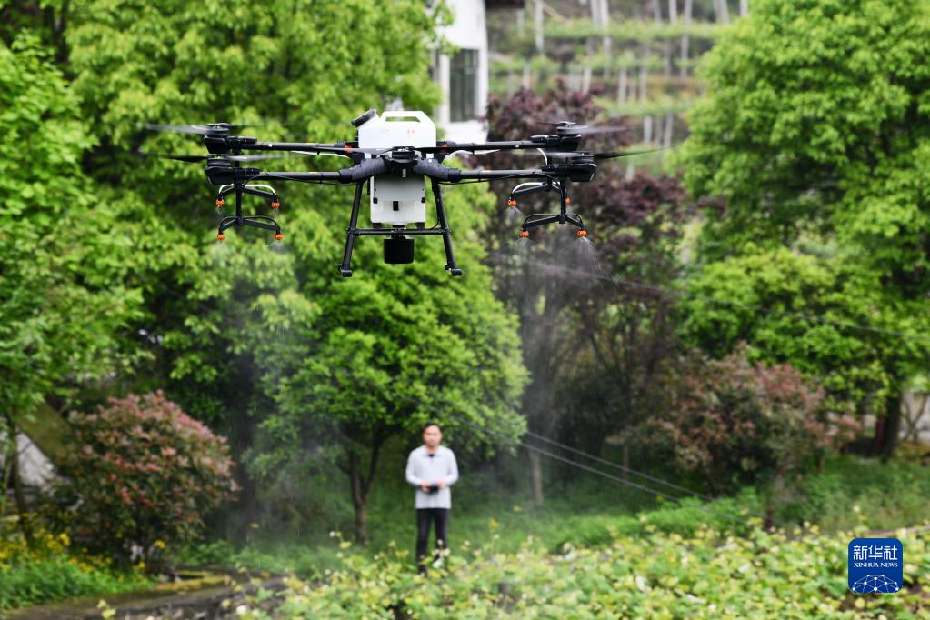 在贵州省贵阳市息烽县小寨坝镇红岩村,农技人员在葡萄基地进行无人机植保作业(2021年4月17日摄)。新华社记者 杨文斌 摄