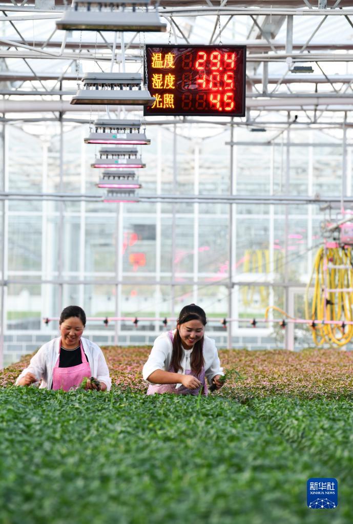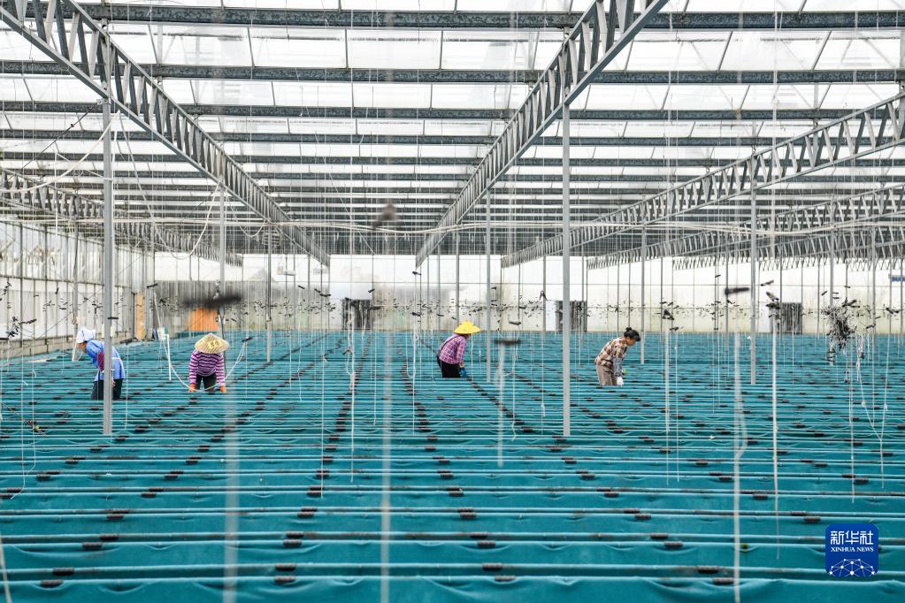 农民在贵州省龙里县湾滩河镇园区村的人工智能调控大棚内管护黄瓜苗(3月19日摄)。新华社记者 杨文斌 摄