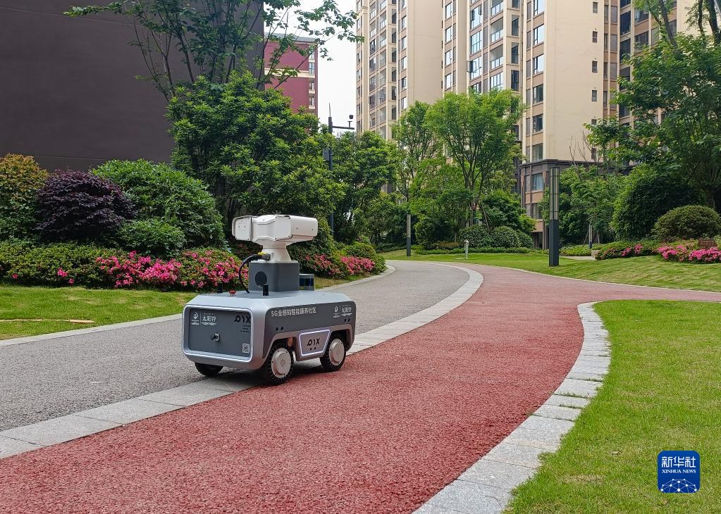 贵州省龙里县中铁国际生态城太阳谷5G全感知智能康养社区内的无人驾驶安防车在运行中(5月23日摄)。新华社记者 刘续 摄