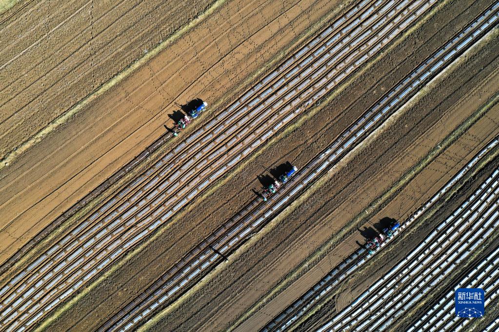 在贵州省威宁县双龙镇凉山社区的众果农机社会化服务基地,农民驾驶马铃薯自动播种机在播种(3月8日摄,无人机照片)。新华社记者 杨文斌 摄