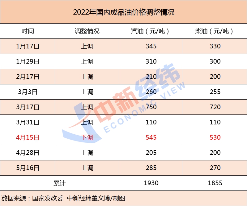 据中新经纬梳理,今年以来,国内成品油价格已进行了九轮调整,汽油价格累计上调1930元/吨,柴油价格累计上调1855元/吨,呈现“八涨一跌零搁浅”格局。