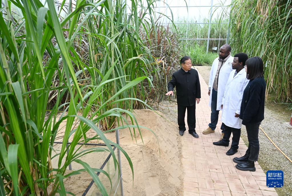2021年11月23日,福建农林大学菌草专家林占熺(左一)在国家菌草工程技术研究中心菌草种质资源圃给外国留学生(左二、左三)讲解菌草的种植培育技术。新华社记者 林善传 摄
