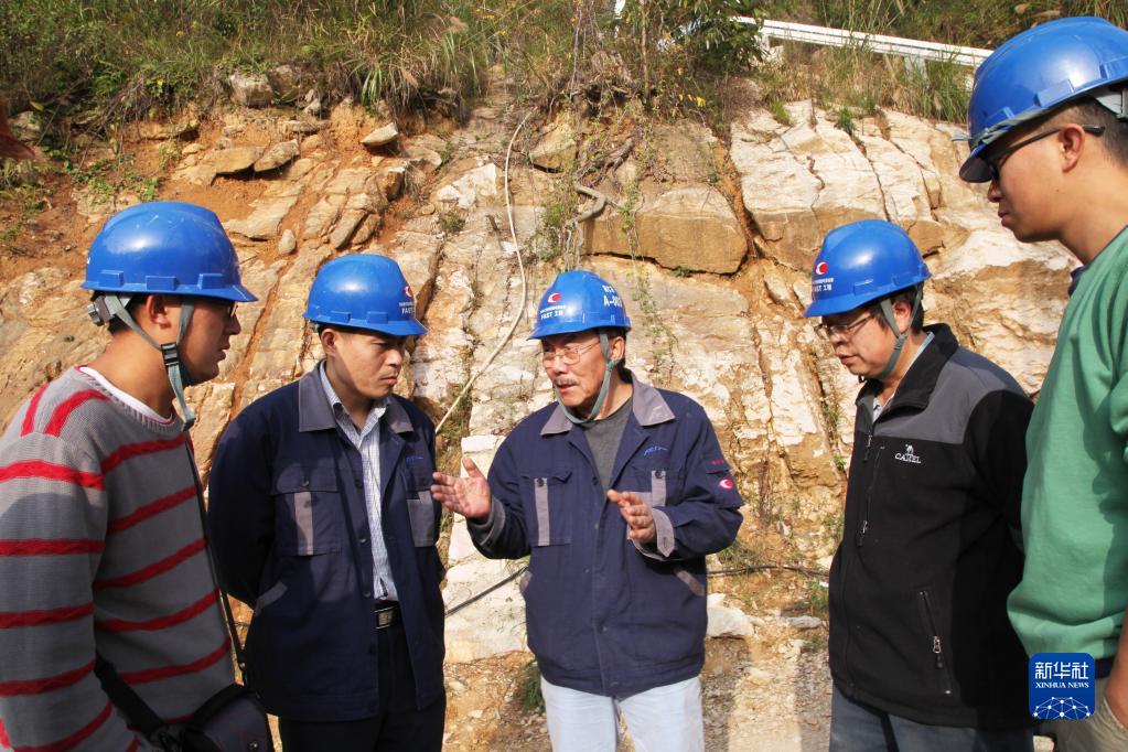 天文学家南仁东(中)与工程技术人员在大窝凼施工现场检查施工进展(2014年12月1日摄)。新华社发(中科院国家天文台供图)
