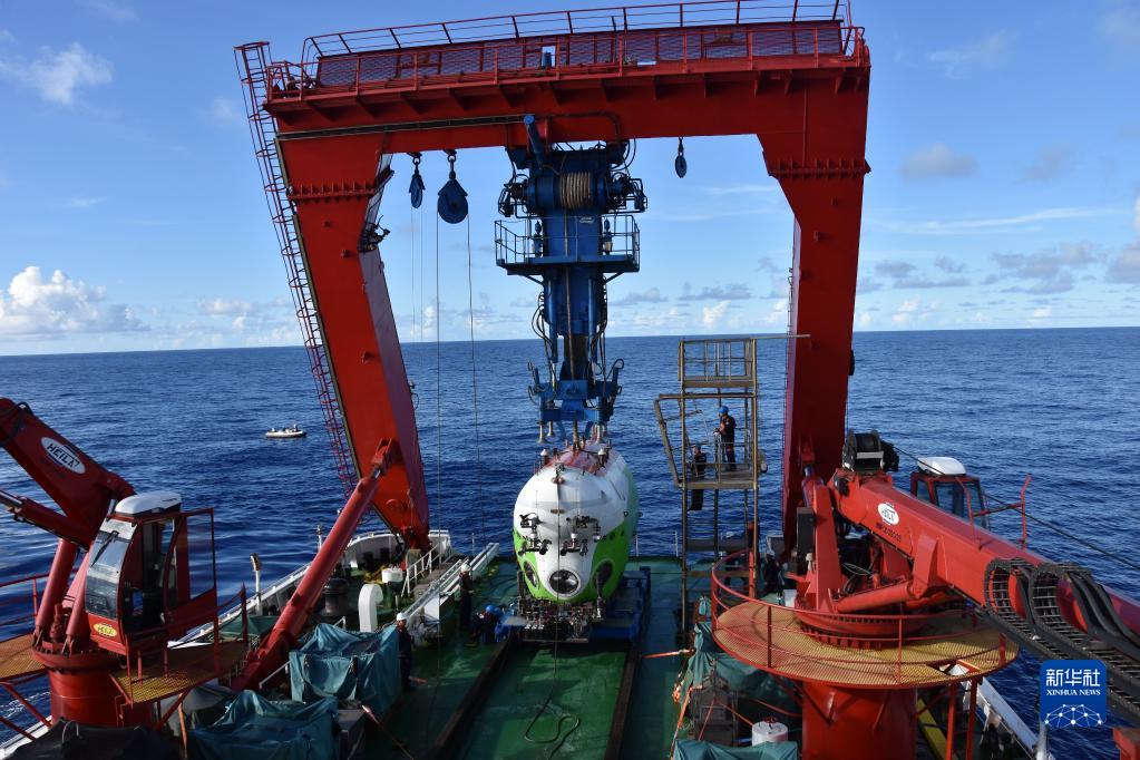 2021年8月18日,工作人员在西太平洋准备从“探索一号”科考船甲板布放“奋斗者”号。新华社记者 陈凯姿 摄