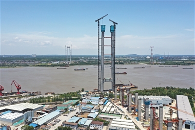 正在建设中的龙潭长江大桥位于南京长江四桥与润扬长江大桥之间,北接扬州仪征市,南接南京市、镇江句容市,双向六车道,设计时速100公里,全长4925米。新华社记者 杨磊 摄