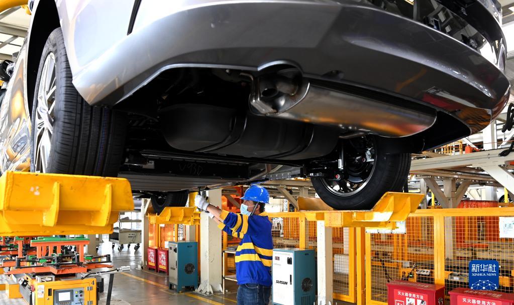 工作人员在西安比亚迪草堂工业园汽车总装厂进行新能源汽车装配(2022年4月20日摄)。新华社记者 刘潇 摄