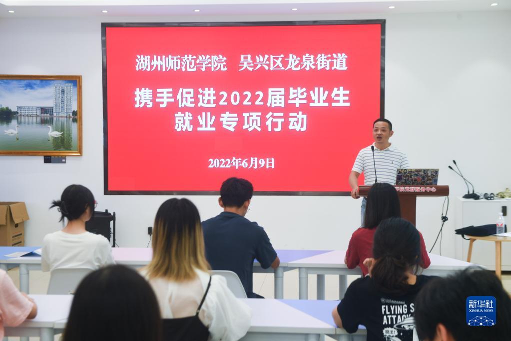浙江省湖州市吴兴区龙泉街道工作人员应邀为湖州师范学院2022届毕业生详细介绍就业创业的相关政策,为毕业生答疑解惑(2022年6月9日摄)。新华社记者 徐昱 摄