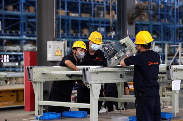 图为5月31日在安徽合肥新站高新区一家智能科技产品生产企业,工人在产品装配生产线上作业。新华社发