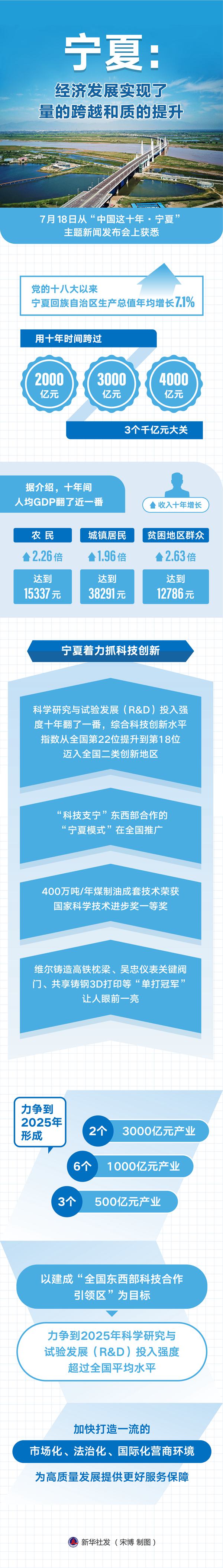 新华社银川7月18日电(记者杨稳玺)记者从18日举行的“中国这十年·宁夏”主题新闻发布会上获悉,党的十八大以来,宁夏回族自治区深入贯彻落实习近平总书记重要指示精神,经济发展实现了量的跨越和质的提升,地区生产总值年均增长7.1%,用十年时间跨过2000亿元、3000亿元、4000亿元3个千亿元大关,现代煤化工、新能源、新材料等在全国有一席之地,枸杞、葡萄酒、奶产业、文化旅游等产业脱颖而出。