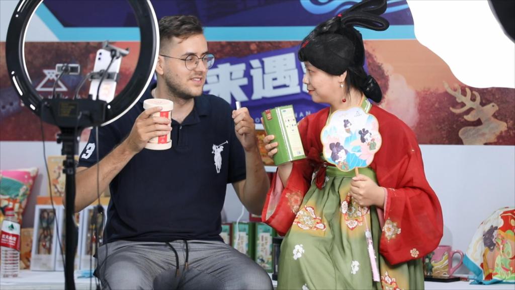在河南云海丝路网络科技有限公司的直播现场,一中一外两名主播正通过TikTok向海外受众介绍河南博物院的文创产品。
