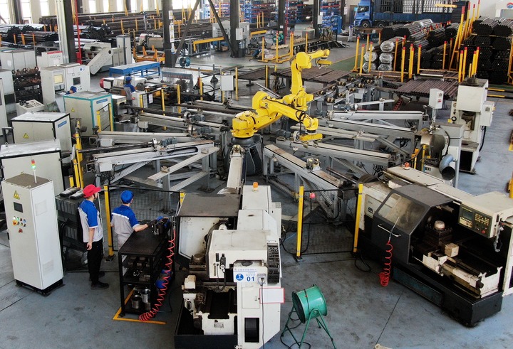 6月17日,在位于秦创原总窗口所在地陕西省西咸新区的陕西太合智能钻探有限公司,全自动环形生产线正在加工钻杆(无人机照片)。新华社记者 李一博 摄