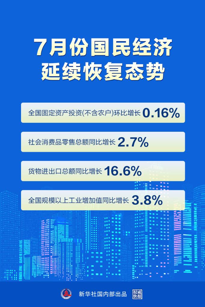 国家统计局15日发布数据显示,7月份,生产供给继续恢复,就业物价总体平稳,对外贸易增势良好,民生保障有力有效,国民经济延续恢复态势。