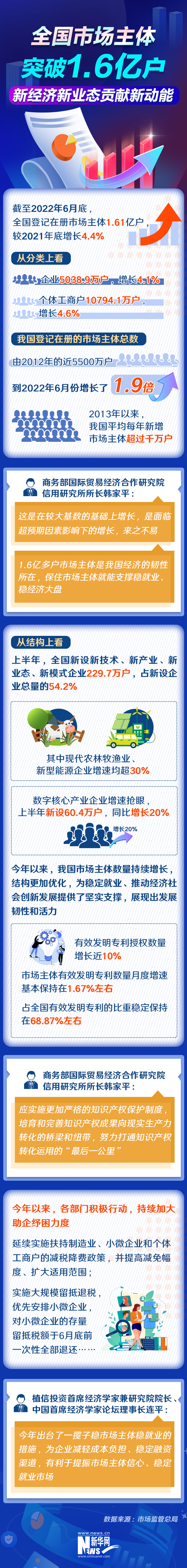 全国登记在册市场主体总数突破1.6亿户,带动就业近3亿人,2013年以来新增的涉税市场主体去年纳税达到4.76万亿元。这有力印证了我国经济的强大韧性,亿户市场主体是稳经济的底气所在。