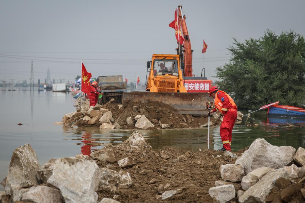 辽宁盘锦,绕阳河溃口抢险现场。中国安能集团投入213人“两班倒”施工,动用219台套机械处置险情;交通部门派出队伍抢通道路,通信管理部门调派应急通信基站车保障通信畅通;300余人的党员抗洪突击队日夜奋战,精细盯防……