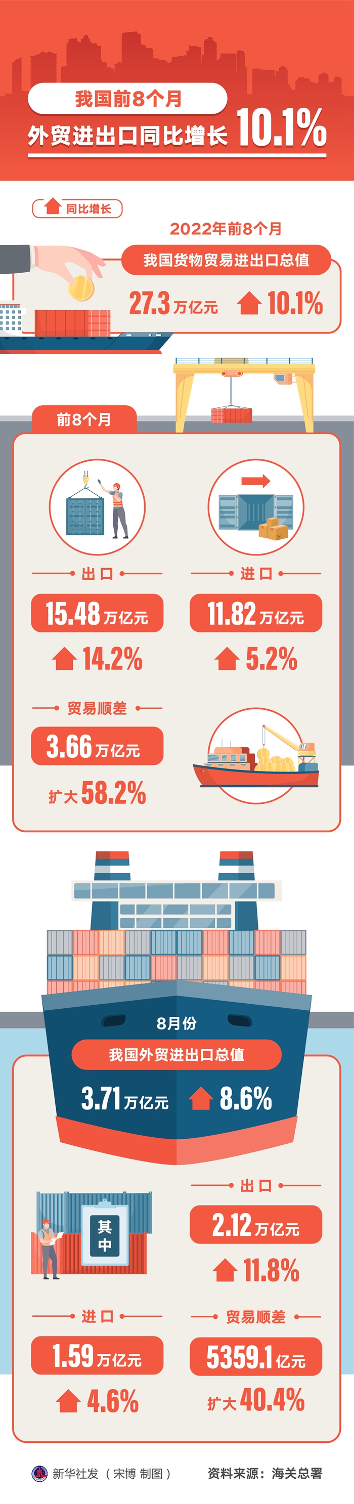 单看8月份,我国外贸进出口总值3.71万亿元,增长8.6%。其中,出口2.12万亿元,增长11.8%;进口1.59万亿元,增长4.6%;贸易顺差5359.1亿元,扩大40.4%。