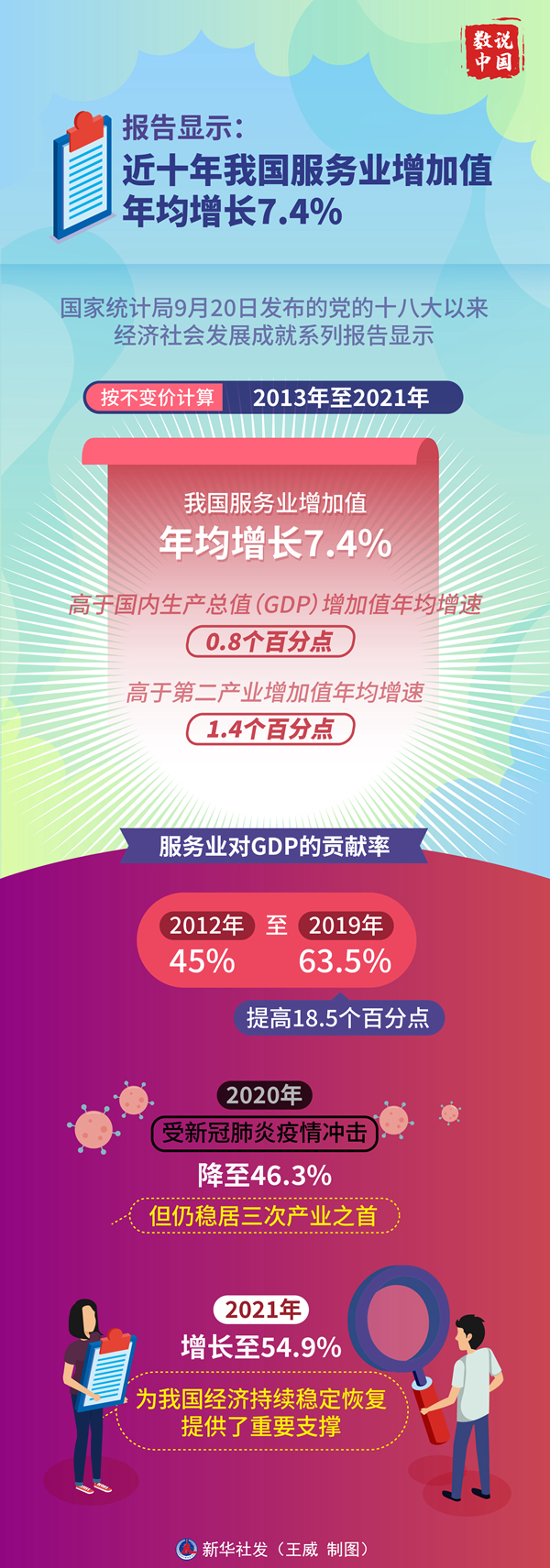 国家统计局20日发布的党的十八大以来经济社会发展成就系列报告显示,按不变价计算,2013年至2021年,我国服务业增加值年均增长7.4%,分别高于国内生产总值(GDP)和第二产业增加值年均增速0.8和1.4个百分点。