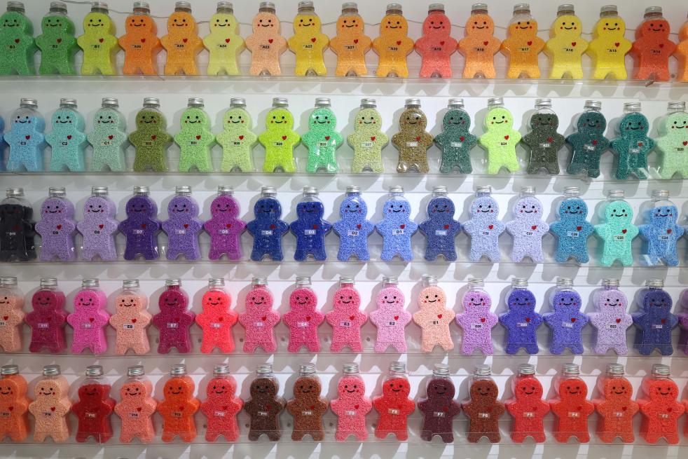 4月14日在江苏省淮安市洪泽区一家手工创意工坊内拍摄的各种颜色的“拼豆”材料。新华社发(殷潮摄)