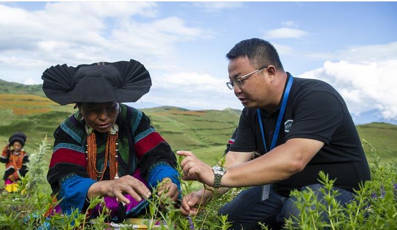 8月14日,在位于四川省凉山彝族自治州昭觉县龙沟乡境内的海拔2850米的波火尔且高山坡地上的黄芩种植基地,西南医科大学副教授夏纪毅(右)为当地彝族群众讲授黄芩种植和采摘技术。