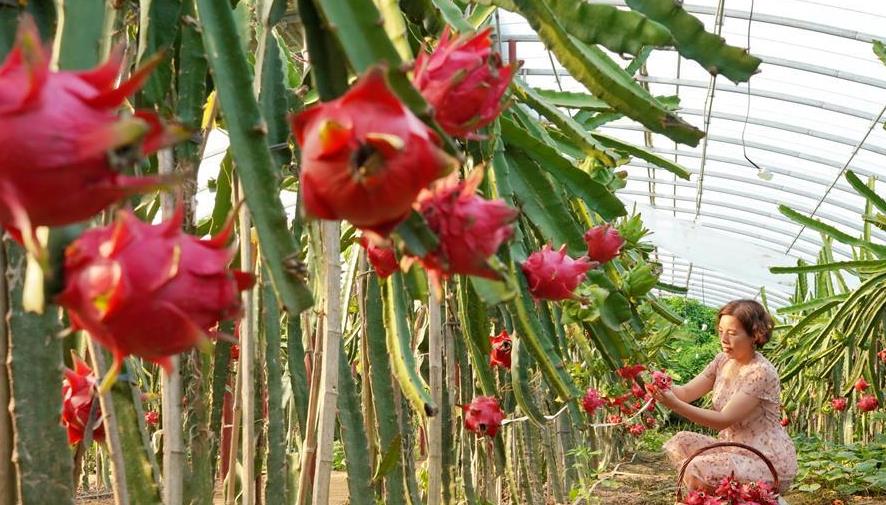 8月15日,游客在河北省内丘县官庄镇辛东庄村火龙果种植大棚内采摘火龙果。 近年来,河北省内丘县不断加大农业结构调整力度,大力发展“南果北种”,并依托当地旅游资源优势,将发展特色种植与生态观光旅游相结合,有效带动当地农民增收致富。