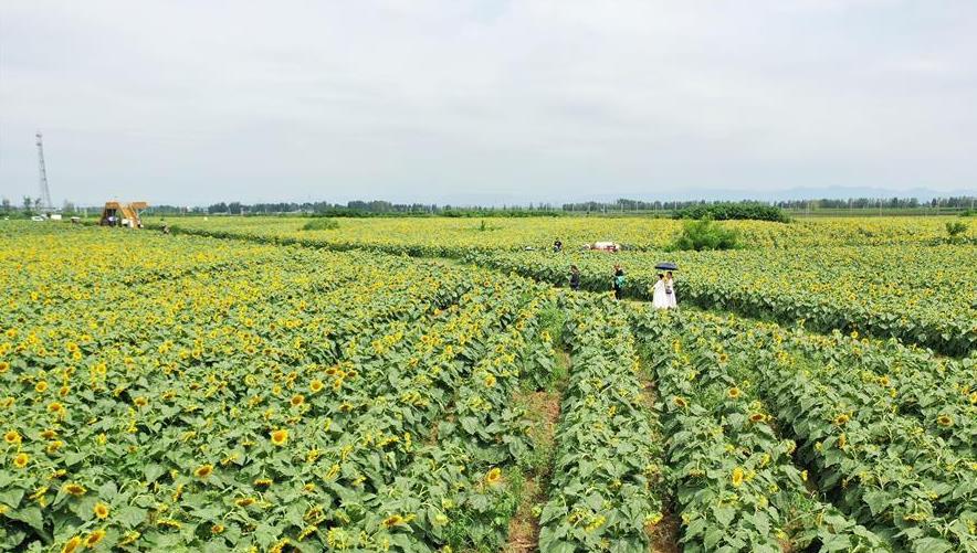 8月18日,游客在河南省平顶山市宝丰县龙王沟乡村振兴示范区油葵基地观赏游玩(无人机照片)。 近日,河南省宝丰县龙王沟乡村振兴示范区种植的近2000亩油葵进入盛花期,金黄色的花海吸引游客前来观赏游玩。近年来,宝丰县积极探索“农业+旅游”的生态观光模式,推进乡村旅游发展,助力农民增收致富。