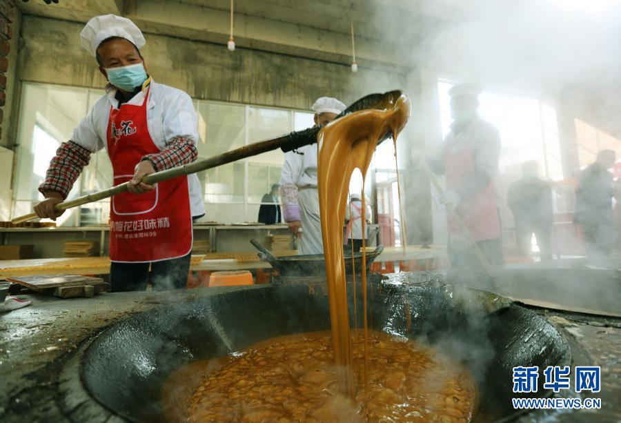 1月13日,工人在贵州省习水县隆兴镇淋滩村一家红糖加工作坊内熬制红糖。