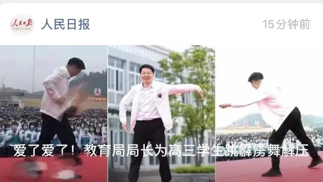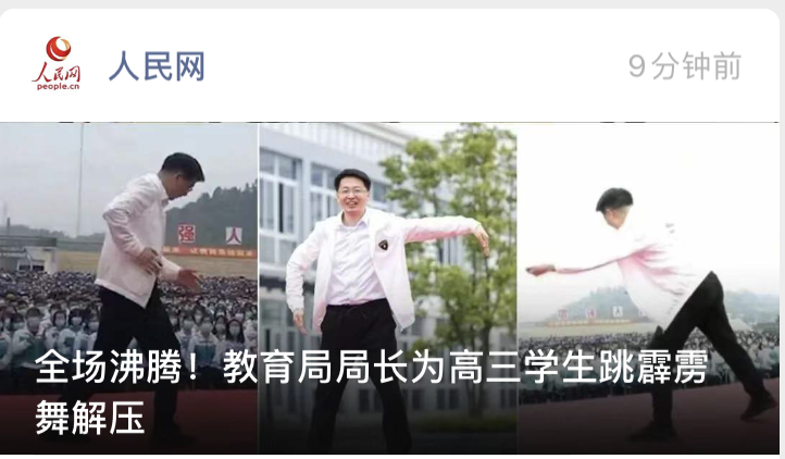 4月10日,犍为县教育局局长段礼富因为一条大会现场即兴为高三学生跳霹雳舞的视频,“出圈”网络。四川日报报道后,还被人民日报、人民网、新华社纷纷转载,冲上各社交媒体平台热搜。