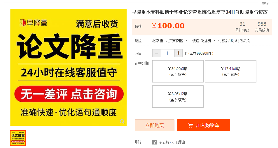 论文降重的“刚需”催生有偿降重的灰色服务。为了不被平台发现,这些商家没有将有偿降重摆上橱窗,或者只在商品图片中显示,将买家引流到个人账号后,再进行交易,根据字数、要求等进行收费,并称“我们是由老师负责修改的”“降重质量包您满意”“我们会附赠一份‘降重指南’”等。有偿论文降重服务的出现,无疑助长了论文抄袭、洗稿问题,甚至公开为抄袭张目,对学术公平和学生的创新能力带来极大的伤害。