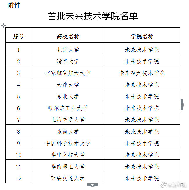 记者26日从教育部官网获悉,教育部办公厅日前下发通知,公布首批未来技术学院名单。包括北京大学、清华大学、北京航空航天大学等12所学校。按照通知,首批学院建设高校要瞄准未来10—15年的前沿性、革命性、颠覆性技术,着力培养具有前瞻性、能够引领未来发展的技术创新领军人才。