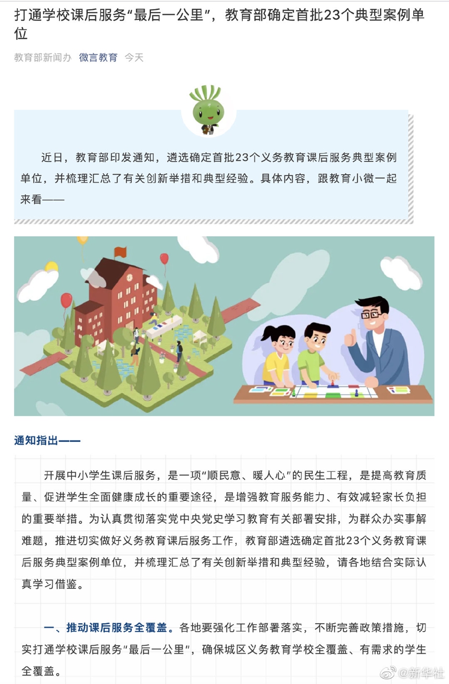 据教育部政务新媒体“微言教育”公众号22日消息,教育部近日印发通知,为推进做好义务教育课后服务工作,遴选确定首批23个义务教育课后服务典型案例单位,并梳理汇总了有关创新举措和典型经验,要求各地结合实际学习借鉴。通知指出,课后服务结束时间原则上不早于当地普遍的正常下班时间后半小时;学校对有特殊需要的学生,可以提供延时托管服务,切实解决好家长接学生困难问题。学校服务性收费和代收费具体政策由各省份制订,严禁以课后服务名义乱收费。 (记者余俊杰)