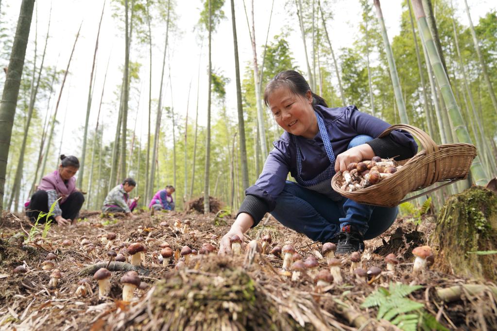 4月19日,农民在贵州省赤水市宝源乡回龙村竹林间采收赤松茸。新华社发(张鹏 摄)