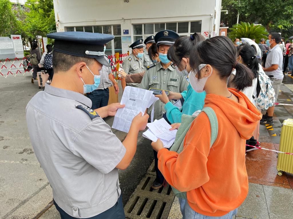 8月31日,四川省芦山中学初一、高一新生有序入学报到,门卫在查看核酸检测报告。(受访者供图)
