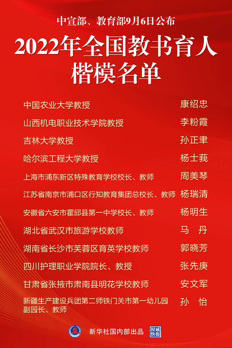 这12位全国教书育人楷模,有的深耕思政课堂、传播党的创新理论,有的勇攀科研高峰、取得显著成果,有的一辈子扎根基层、矢志奉献山区教育,有的创新思路方法、为孩子倾注大爱深情,充分展示了新时代教师队伍有理想信念、有道德情操、有扎实学识、有仁爱之心的良好精神风貌,是广大人民教师的优秀代表和杰出典范。他们是:中国农业大学教授康绍忠,山西机电职业技术学院教授李粉霞,吉林大学教授孙正聿,哈尔滨工程大学教授杨士莪,上海市浦东新区特殊教育学校校长、教师周美琴,江苏省南京市浦口区行知教育集团总校长、教师杨瑞清,安徽省六安市霍邱县第一中学校长、教师杨明生,湖北省武汉市旅游学校教师马丹,湖南省长沙市芙蓉区育英学校教师郭晓芳,四川护理职业学院院长、教授张先庚,甘肃省张掖市肃南县明花学校教师安文军,新疆生产建设兵团第二师铁门关市第一幼儿园副园长、教师孙怡。