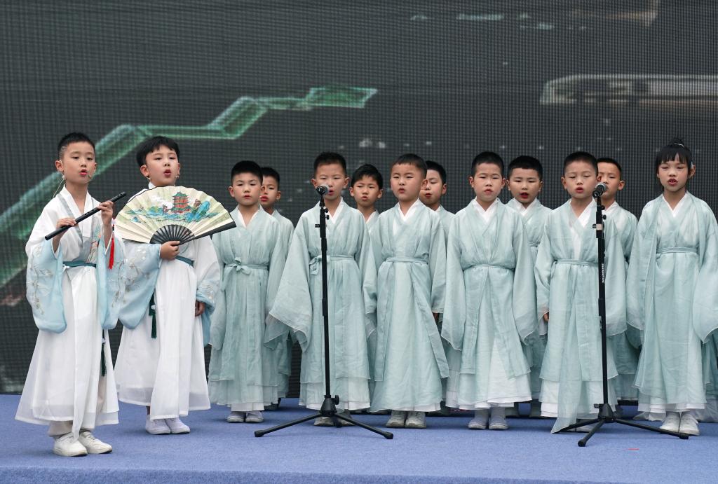 4月20日,江西师范大学附属博文实验学校学生在启动仪式现场诵读《滕王阁序》。新华社记者 万象 摄