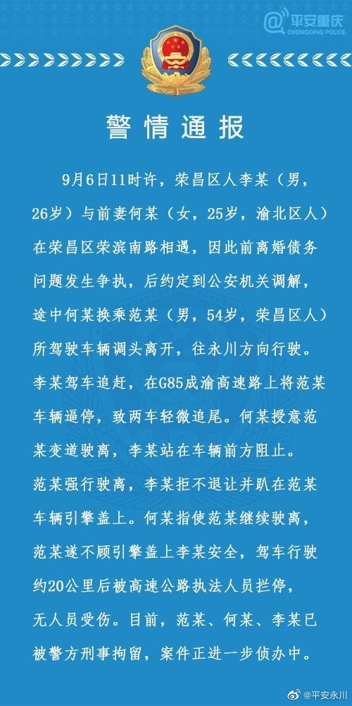 据重庆市永川区公安局9月7日通报:9月6日11时许,荣昌区人李某(男,26岁)与前妻何某(女,25岁,渝北区人)在荣昌区荣滨南路相遇,因此前离婚债务问题发生争执,后约定到公安机关调解,途中何某换乘范某(男,54岁,荣昌区人)所驾驶车辆调头离开,往永川方向行驶。李某驾车追赶,在G85成渝高速路上将范某车辆逼停,致两车轻微追尾。何某授意范某变道驶离,李某站在车辆前方阻止。范某强行驶离,李某拒不退让并趴在范某车辆引擎盖上。何某指使范某继续驶离,苑某遂不顾引擎盖上李某安全,驾车行驶约20公里后被高速公路执法人员拦停,无人员受伤。目前,范某、何某、李某已被警方刑事拘留,案件正进一步侦办中。