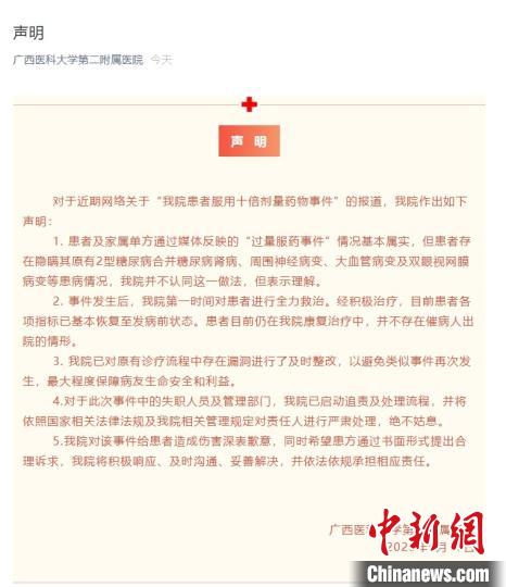 针对该事件,广西医科大学第二附属医院17日下午发布声明称,患者及家属单方通过媒体反映的“过量服药事件”情况基本属实,但患者存在隐瞒其原有2型糖尿病合并糖尿病肾病、周围神经病变、大血管病变及双眼视网膜病变等患病情况。