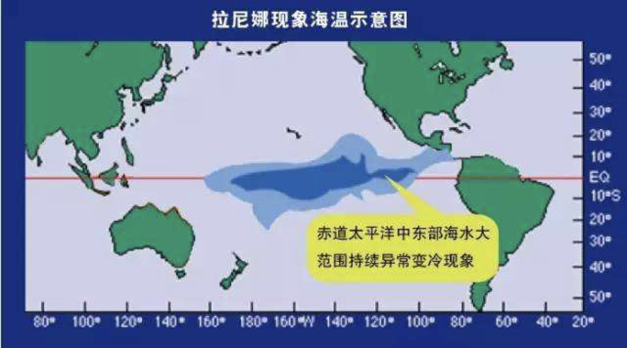 袁媛介绍,拉尼娜状态(事件)指的是赤道中、东太平洋海水表面温度与常年同期相比出现大范围偏冷,并且强度和持续时间达到一定条件的现象。