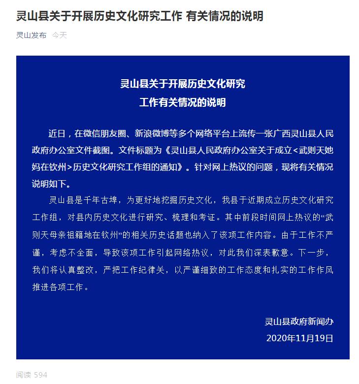 说明称,灵山县是千年古埠,为更好地挖掘历史文化,灵山县于近期成立历史文化研究工作组,对县内历史文化进行研究、梳理和考证。其中前段时间网上热议的“武则天母亲祖籍地在钦州”的相关历史话题也纳入了该项工作内容。由于工作不严谨,考虑不全面,导致该项工作引起网络热议,对此深表歉意。下一步,将认真整改,严把工作纪律关,以严谨细致的工作态度和扎实的工作作风推进各项工作。
