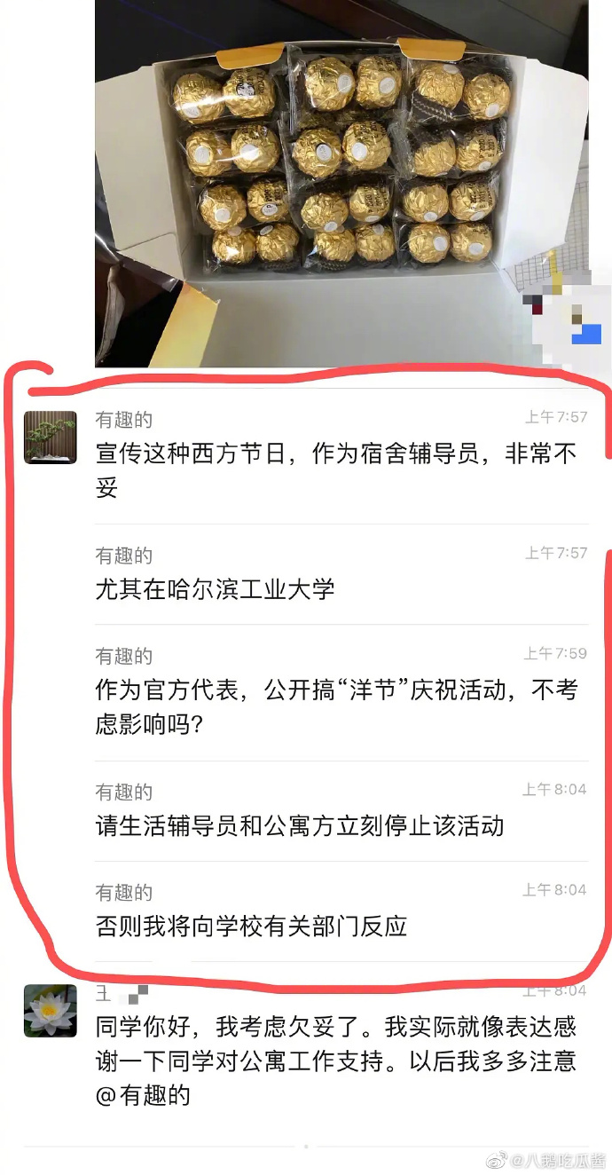 群内成员“有趣的”称,“宣传这种西方节日,作为宿舍辅导员,非常不妥。尤其在哈尔滨工业大学。作为官方代表,公开搞‘洋节’庆祝活动,不考虑影响吗?” “有趣的”表示,如不停止,自己将向学校有关部门反映。