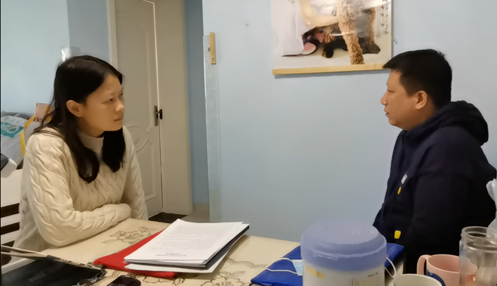 记者王优玲(左)采访世界名园小区业主(记者 张超 摄)