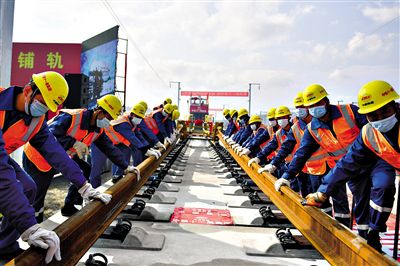 图为当日施工人员在杭绍台铁路上进行铺轨作业。