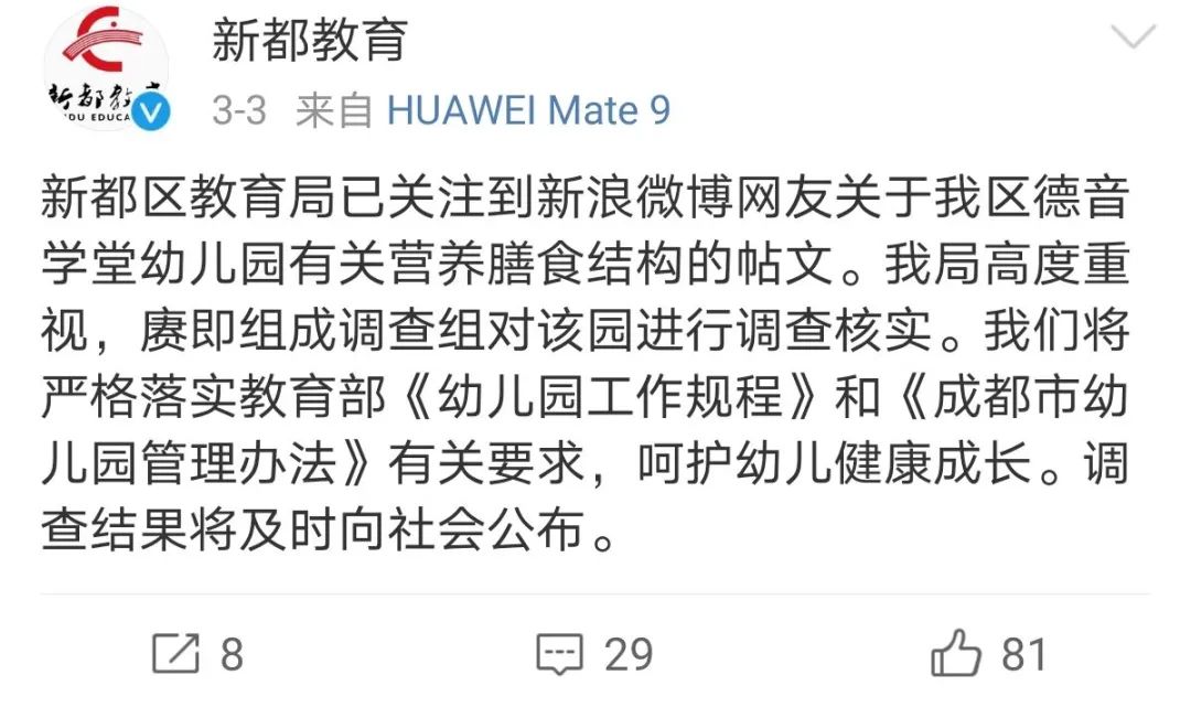 3月3日,成都市新都区教育局官方微博 @新都教育 回应称,“我局高度重视,赓即组成调查组对该园进行调查核实。”