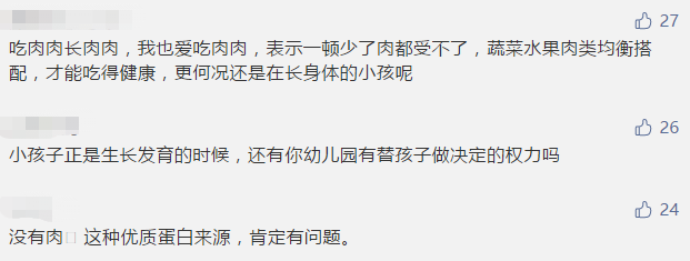 但更多的网友表示质疑,认为肉类有孩子生长必不可少的营养成分。