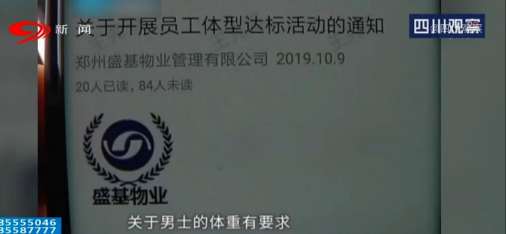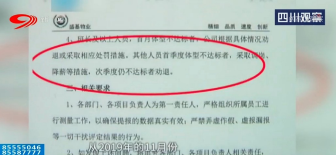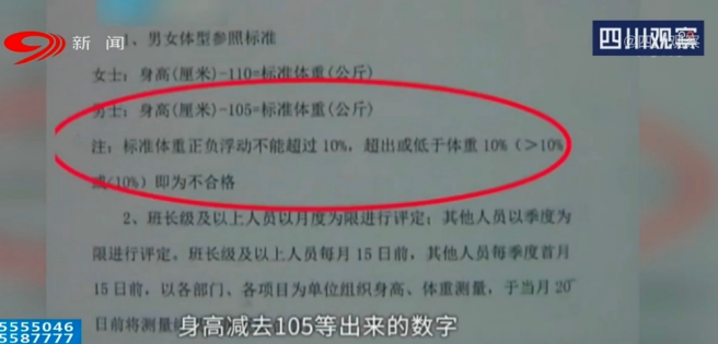 但是在2019年10月9日,公司突然下发《关于开展员工体型达标活动的通知》。文件中写明了男女体型参考标准,其中男性体重标准是身高减去105得出来的数字,超出或低于标准体重的10%即为不合格。