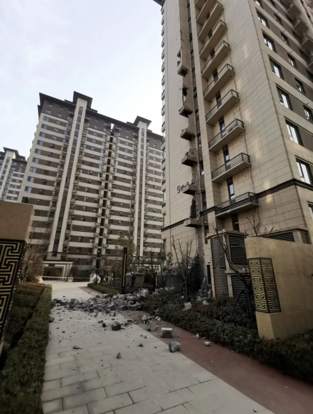 记者在现场看到,坍塌部分涉及一层到九层,大石块散落一地。一些业主表示,这些精装房问题不少,包括阳台梁开裂、入户门有裂缝、地板空鼓、过门石开裂等。