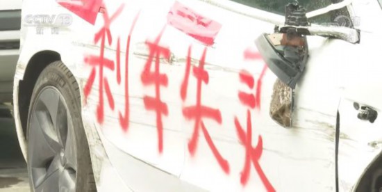 在河南郑州的特斯拉4S店门外,这辆特斯拉Model3已经停放了两个月,车上粉刷的“刹车失灵”四个大字十分刺眼。它是一年多前李先生花36.8万为妻子购买。张女士对这辆车一直非常满意,直到今年2月,事发前五天,这辆车出现过一次疑似“刹车失灵”。